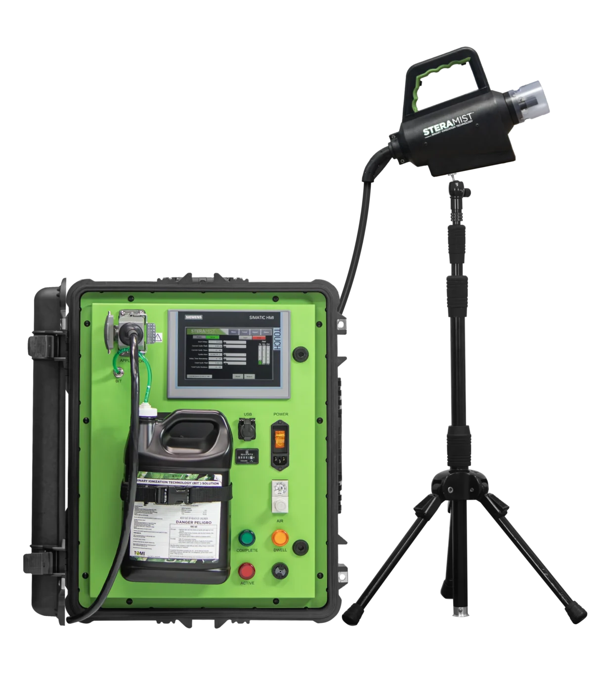 Move the SteraMist Standalone to any area in need of iHP decontamination, connect the standard applicator to a stand, and fully fog the space with comprehensive controls.